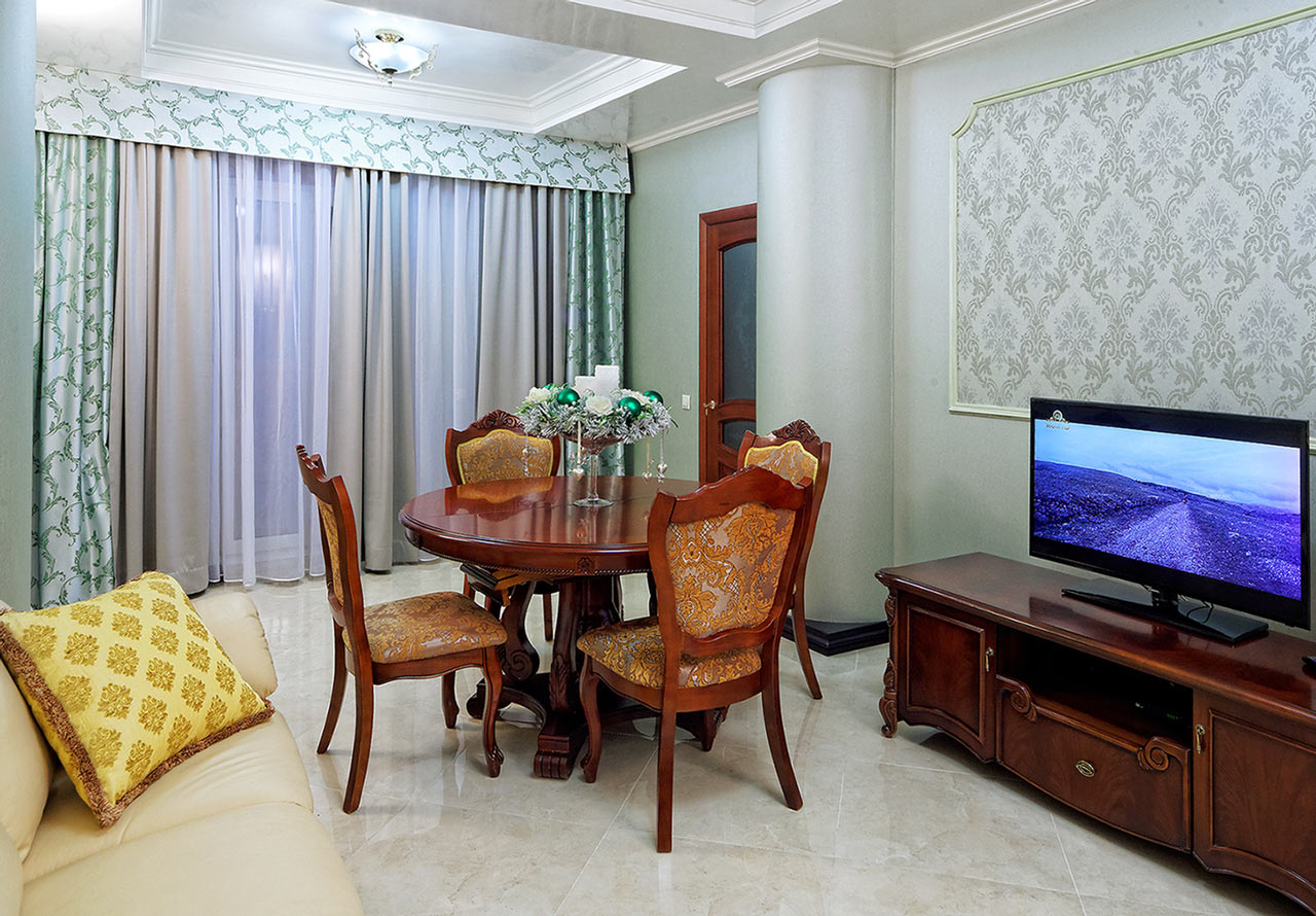 Просторий номер з двома спальнями та вітальнею. Також тут передбачено два санвузли (в одному - велика ванна, а в іншому - душова)